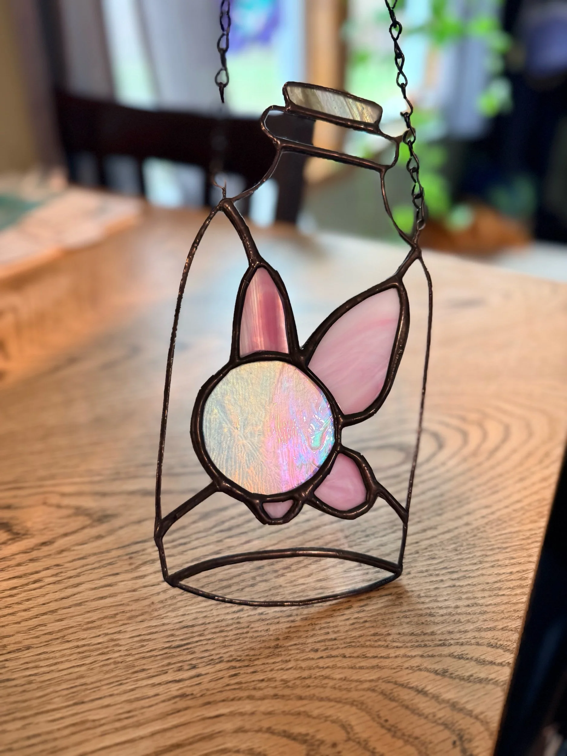 The fairy body is an iridized white glass by Youghiogheny, and the pink wings are feature a soft white and pink mix. The bottle is a true clear glass, and topped with a brown piece to make the cork!